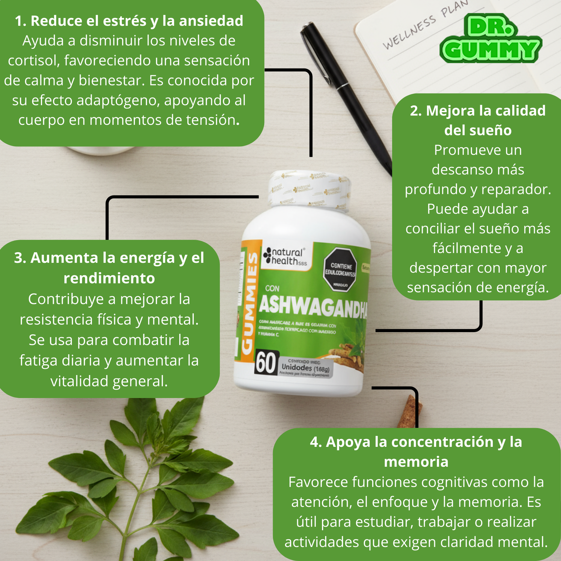Nuestras Gomitas de Ashwagandha fortificadas con Magnesio y Vitamina C potencian este efecto para que realmente notes la diferencia.